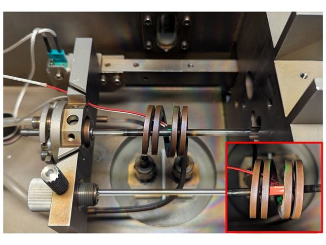 - A thermocouple is spot-welded to a steel specimen to measure and control temperature.