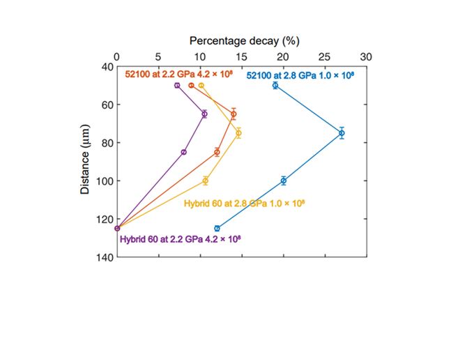 The most interesting result is that Hybrid Steel 60 had less microstructural decay after the same number of stress cycles (1.0 × 108) compared to 52100 steel, as illustrated in the graph.